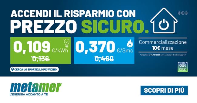 Di fronte a questo momento incerto sui mercati energetici è fondamentale rivolgersi a gestori seri, pronti a offrire soluzioni in grado di proteggere i propri clienti. È questo l’impegno di Metamer, azienda leader in Abruzzo e Molise nella vendita di gas e luce e altre soluzioni di efficienza energetica, che ha messo a punto un’opportunità unica: l’offerta “Prezzo Sicuro Luce & Gas” che assicura un prezzo fisso e molto competitivo per la fornitura di energia, garantendo tranquillità e stabilità anche in un contesto di aumenti vertiginosi dei costi. L’offerta consente, infatti, di bloccare subito il costo della materia prima su luce (0,109 €/kWh) e gas (0,370 €/Smc), al prezzo più vantaggioso degli ultimi mesi, mettendo al sicuro i consumi per un intero anno.