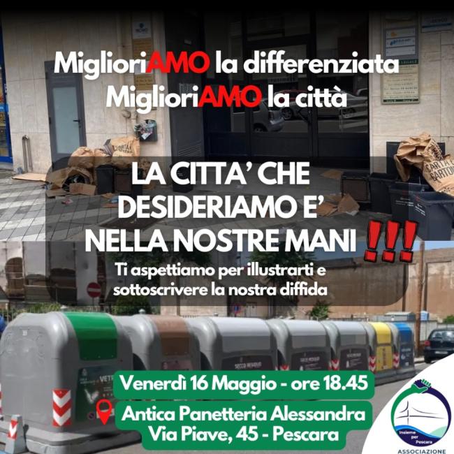 Venerdì 16 maggio, in un incontro pubblico, “Insieme Per Pescara” illustrerà i contenuti della diffida con la quale chiederà all'amministrazione comunale la risoluzione delle “diffuse criticità che incombono in diverse zone della città a causa di un sistema di raccolta dei rifiuti cosiddetto porta a porta inadeguato, inefficiente e inefficace che espone quotidianamente i cittadini a concreti rischi per la loro salute e inficia il la pulizia, la salubrità e il decoro delle nostre strade e delle nostre piazze”.