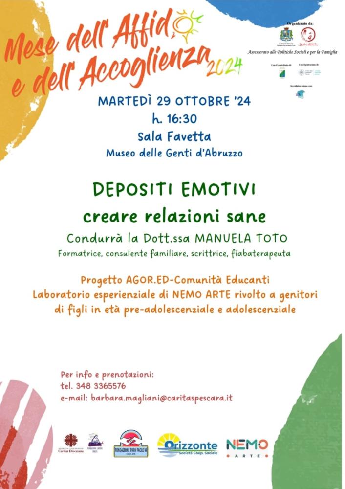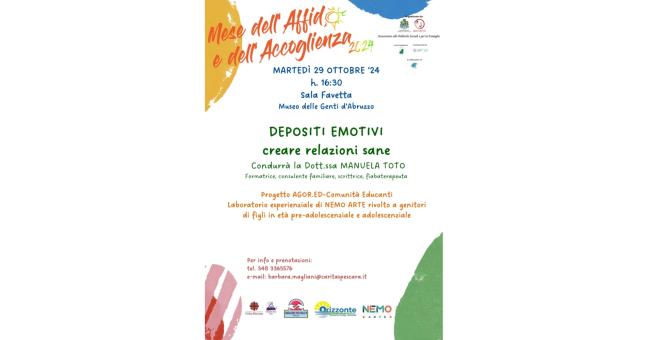 Il mese dell'Affido e dell'accoglienza promosso dall’assessorato comunale alle Politiche sociali e della famiglia per il 2024 si conclude con due appuntamenti. Il primo è in programma domani, martedì 29 ottobre, alle ore 17 nella sala Favetta del Museo delle Genti di Abruzzo, ed è un laboratorio esperienziale gratuito rivolto ai genitori, agli insegnanti, agli educatori. Il titolo è "Depositi Emotivi - creare relazioni sane". L’incontro sarà condotto dalla dottoressa Manuela Toto, a cura della Caritas diocesana, all'interno del progetto comunale Agor.ed - Comunità educante.