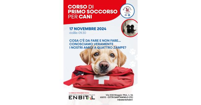 Domenica 17 novembre alle ore 9.30, presso la sede dell'Enbital (Ente Nazionale Bilaterale Italiano) a Città Sant'Angelo, si terrà una lezione di primo soccorso per gli amici a quattro zampe: in una situazione di emergenza che vede coinvolto il cane da compagnia cosa c'è da fare o cosa non va assolutamente fatto?