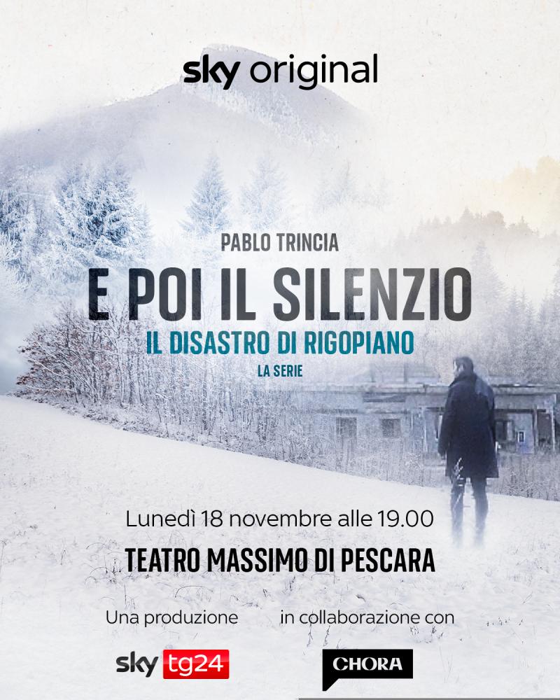La docuserie Sky Original "E poi il silenzio - Il disastro di Rigopiano" sarà presentata in anteprima a Pescara, presso il Teatro Massimo, lunedì 18 novembre alle ore 19 (ingresso del pubblico a partire dalle ore 18:15). La serie arriva dopo il successo del podcast di Pablo Trincia e sarà disponibile on air a partire dal 20 novembre. "E poi il silenzio - Il disastro di Rigopiano" è prodotto da Sky Italia e Sky Tg24 e realizzato in collaborazione con Chora Media. Per partecipare gratuitamente ci si può iscrivere qui: https://tinyurl.com/wzhunacm