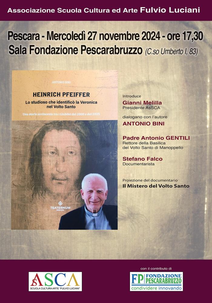 L’incontro, aperto a tutti, è promosso dall’Associazione Scuola Cultura Arte “Fulvio Luciani” di Pescara, presieduta da Gianni Melilla il quale ha spiegato come “Antonio Bini con questo suo saggio, rende onore a padre Heinrich Pfeiffer, docente di storia dell’arte cristiana alla Pontificia Università Gregoriana di Roma e tra i massimi studiosi contemporanei dei Beni culturali della Chiesa. Con i suoi studi sul Volto Santo e la Veronica, Pfeiffer come Davide sfidò il Golia dei sindonologi evidentemente “irritati” da una tesi che disturbava convinzioni secolari sui teli funerari di Cristo. L’Associazione Scuola Cultura ed Arte ritiene importante valorizzare il patrimonio storico-religioso della nostra Regione e per questo abbiamo voluto presentare questo libro così interessante”.