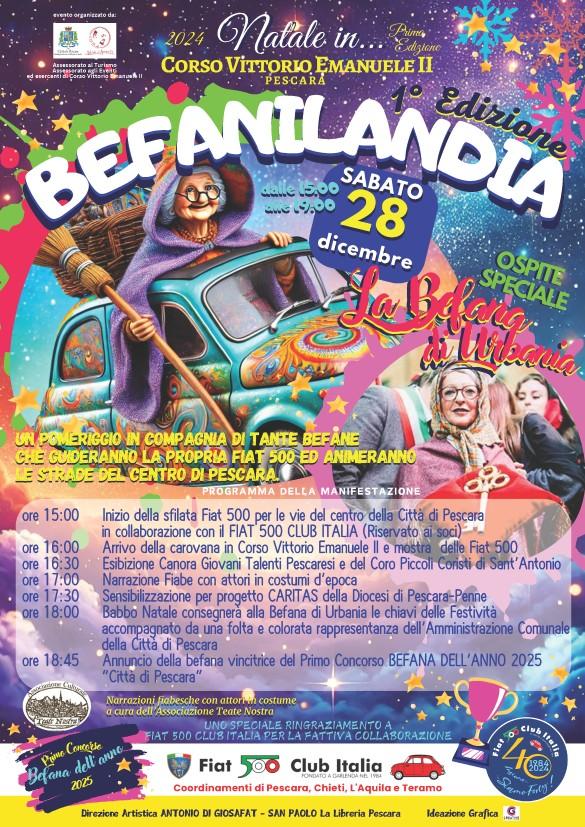 Appuntamento sabato 28 dicembre, dalle 15 lungo Corso Vittorio Emanuele II, con “Befanilandia”, manifestazione alla sua 1a edizione organizzata dagli esercenti locali – con la direzione artistica affidata ad Antonio Di Giosafat della Libreria San Paolo – e dall’amministrazione di Pescara in particolare dagli Assessorati alle Manifestazioni e Commercio. Nel corso dell’allegro pomeriggio, dopo balli, giochi e scherzi, i partecipanti potranno votare la Befana dell’Anno con una giuria presieduta dalla Befana di Urbania, cittadina marchigiana che raggiungerà Pescara in pompa magna per siglare un importante patto di amicizia.