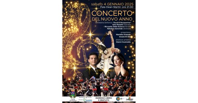 Sabato 4 gennaio alle 21 appuntamento al Pala Dean Martin di Montesilvano con il Concerto del Nuovo Anno che vedrà protagonisti l’Orchestra Sinfonica Duchi D’Acquaviva città di Atri coadiuvata dal direttore artistico Algino Battistini e diretta dal maestro Nataliya Gonchak, il soprano Sara Rossini e il tenore Riccardo Della Sciucca e ospite speciale della serata, direttamente da Ballando con le stelle, la straordinaria Veera Kinunnen che danzerà con coppie di ballerini professionisti. Il tutto per la direzione artistica di Gianni Scannella. Un viaggio musicale attraverso le composizioni più celebri della storia. Un’atmosfera coinvolgente per celebrare l'inizio del nuovo anno in modo originale e suggestivo, offrendo alla cittadinanza un'opportunità unica di godere di musica, danza e spettacolo dal vivo.