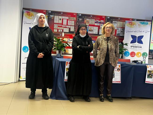 “In cucina, come nella vita e in ogni lavoro, occorre amore, passione, spirito di libertà, etica alimentare e dedizione per riuscire e fare bene. Agli studenti dell’Istituto Alberghiero di Pescara ricordiamo di coltivare sempre il proprio talento, di impegnarsi per trovare la propria strada senza condizionamenti né pregiudizi, rispettando l’ambiente, la tradizione, impegnandosi nella ‘cucina anti-spreco’ di storia benedettina, e nella solidarietà verso chi vive nel disagio”. Sono le parole che Suor Myriam D’Agostino ha rivolto oggi ai ragazzi dell’Istituto Alberghiero Ipssar ‘De Cecco’ di Pescara, accompagnata da Suor Valentina, novizia del Monastero delle Benedettine di Sant'Anna nei pressi di Assisi, a Bastia Umbra, entrambe protagoniste, con Madre Noemi Scarpa, Suor Debora e Suor Eleonora del programma di Food Network ‘La cucina delle monache’. A coordinare l’incontro la dirigente dell’Istituto Alberghiero Ipssar ‘De Cecco’ Alessandra Di Pietro, Antonio Di Giosafatt Direttore della Libreria San Paolo, Nino Di Francesco Delegato regionale FACI, Don Antonio De Grandis Presidente del Tribunale Ecclesiastico Abruzzo e Molise, Nadia Palumbo.