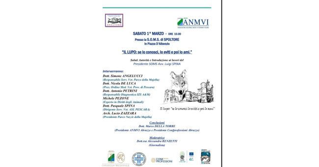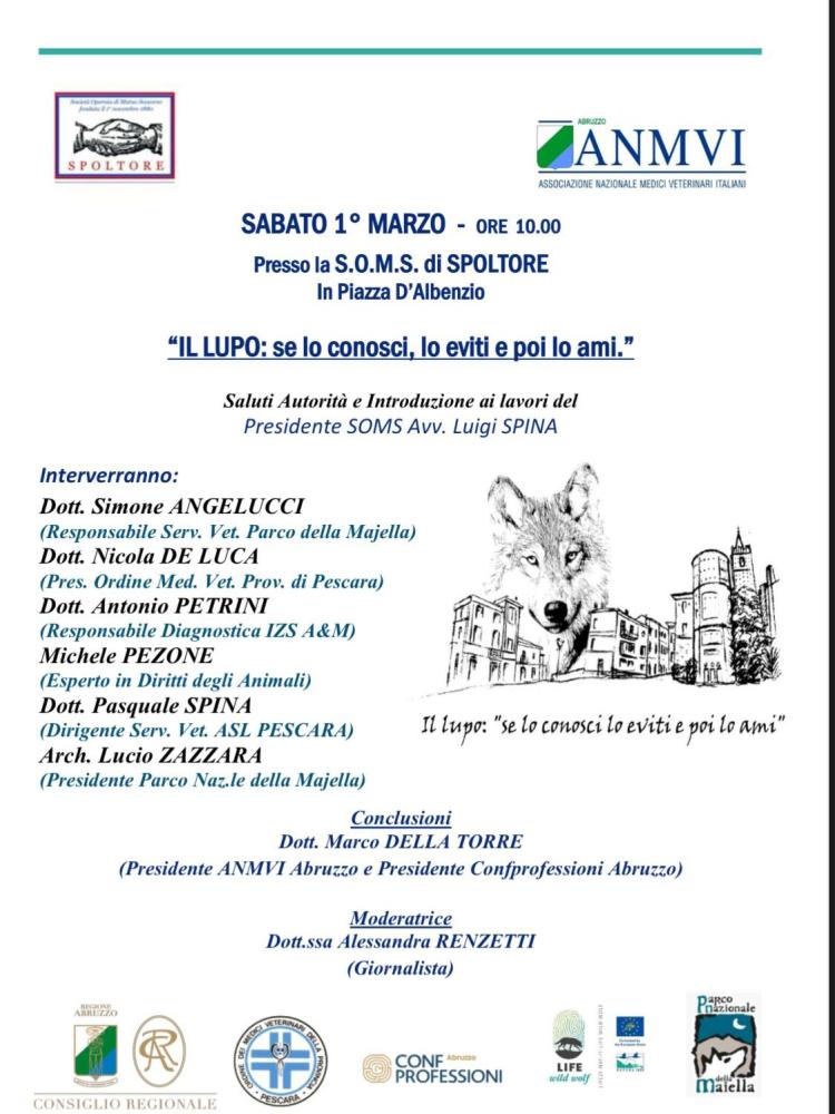 Dopo i saluti delle autorità e del presidente SOMS, l'Avvocato Luigi Spina, interverranno il Dottor Simone Angelucci, Responsabile del servizio veterinario del Parco Maiella; il Dottor Nicola De Luca per l'Ordine dei Medici veterinari della Provincia di Pescara; il Dottor Antonio Petrini, Responsabile diagnostica IZS A&M; Michele Pezone, esperto in diritti degli animali; il Dottor Pasquale Spina, Dirigente del servizio veterinario ASL di Pescara; l'Architetto Lucio Zazzara, Presidente del Parco Nazionale della Maiella. Modera la giornalista Alessandra Renzetti.