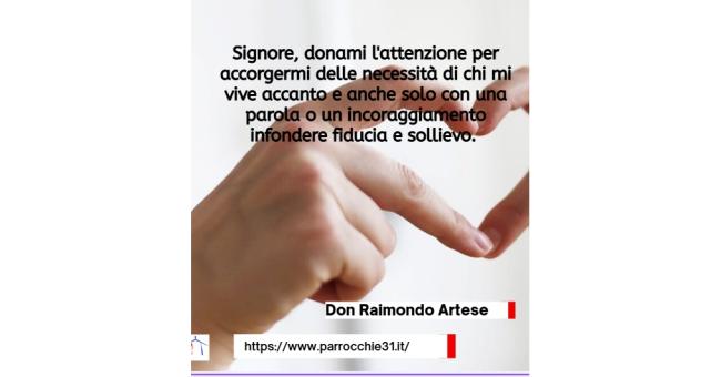 Signore, donami l'attenzione per accorgermi delle necessità di chi mi vive accanto e anche solo con una parola o un incoraggiamento infondere fiducia e sollievo. Amen