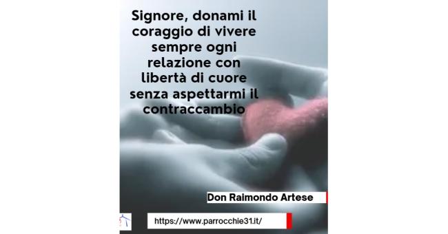 Signore, donami il coraggio di vivere sempre le relazioni e i rapporti con libertà di cuore senza aspettarmi nulla e nessun compenso perché possa essere pronto a donarsi all’altro come hai fatto Tu. Amen