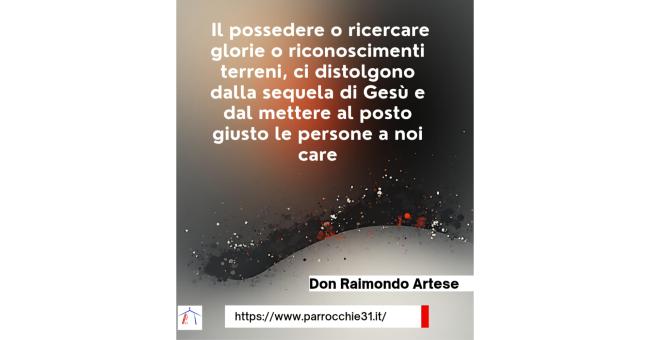 Anche, per me e te, il possedere o ricercare glorie o riconoscimenti terreni, ci distolgono dalla sequela di Gesù perché sempre più chiaramente, abbagli dell’apparire da cui ci lasciamo ingannare, ci distolgono dal vivere la sua Parola. Anche perché l'essere umano, se non è illuminato dallo Spirito, viene guidato dai suoi desideri e Dio, che non è padrone ma padre, che ci vuole come figli, liberi dagli inganni e dalle seduzioni. Se scegliamo Lui possiamo godere, già in questa vita, del suo amore e sentirci appagati e sazi nell'anima e nella mente.