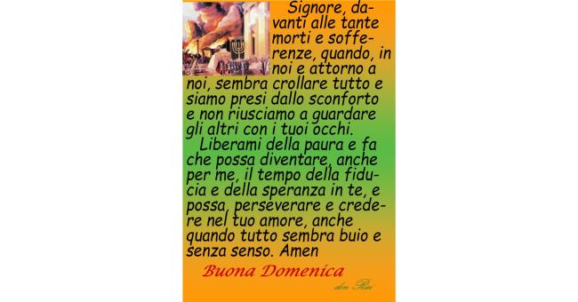 Signore, liberami della paura e fa che possa diventare, anche per me, questo il tempo della fiducia e della speranza in te, e possa, perseverare e credere nel tuo amore, anche quando tutto sembra buio e senza senso. Amen