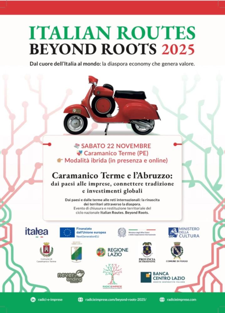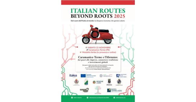Sabato 22 novembre, a partire dalle ore 10, Caramanico Terme ospita la tappa abruzzese di Italian Routes – Beyond Roots 2025, il ciclo di eventi dedicato alla valorizzazione economica e territoriale delle radici italiane promosso da Italea Abruzzo, Italea Lazio e NeverEndingTourism nell’iniziativa “Radici e Imprese”, in collaborazione con le Regioni Abruzzo e Lazio e con il supporto del MAECI.