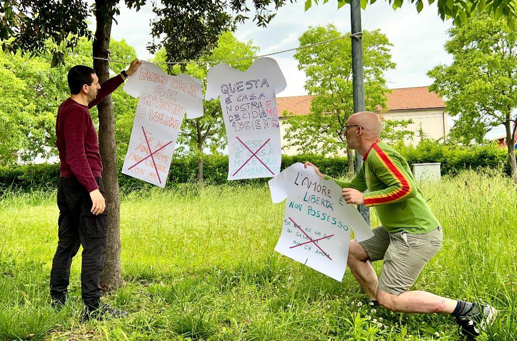 Alla fine del percorso, questi “panni” verranno simbolicamente stesi in pubblico, appesi a fili tenuti da altri uomini, a rappresentare la volontà di “lavare i panni sporchi” della violenza non più in privato, ma alla luce del sole, rompendo il muro di omertà e indifferenza.