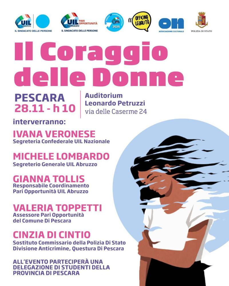 Venerdì 28 novembre, alle ore 10, all'Auditorium Petruzzi di Pescara - via delle Caserme, 24 a Pescara - si terrà l'incontro "Il coraggio delle donne" promosso da Uil Abruzzo attraverso il Coordinamento Uil Pari Opportunità e l'Officina della Legalità del Premio nazionale Paolo Borsellino.