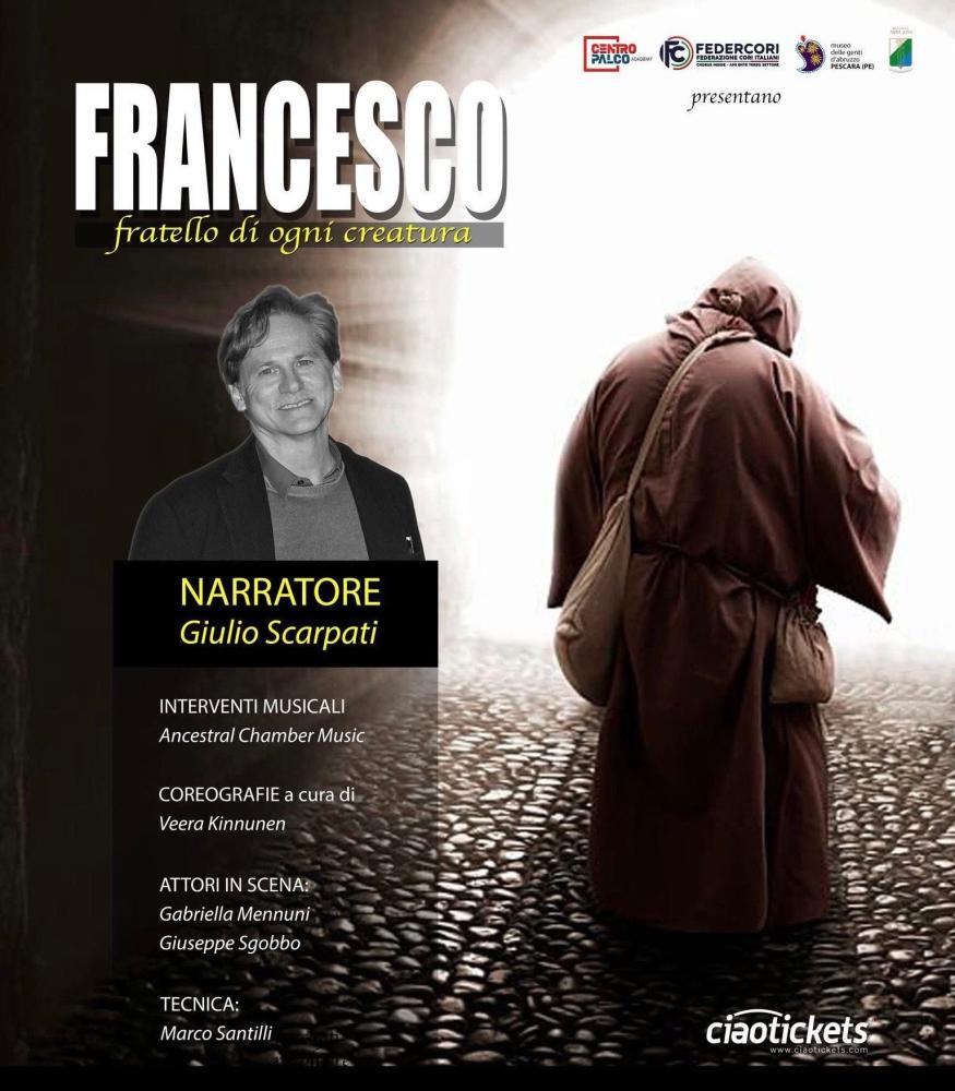 Ha debuttato il 19 dicembre, nella suggestiva cornice del Museo delle Genti d’Abruzzo di Pescara all’interno dell’Auditorium Petruzzi, lo spettacolo teatrale Francesco - Fratello di ogni creatura, una produzione della Centro Palco Academy che unisce parola, corpo e musica in un racconto scenico di forte intensità spirituale e artistica.