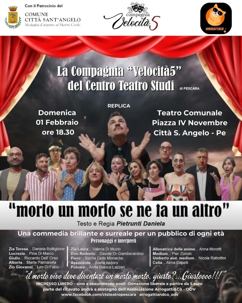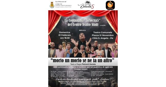 Dopo aver ottenuto consensi entusiasti da pubblico e critica per la rappresentazione messa in scena lo scorso 14 dicembre, a grande richiesta la Compagnia “Velocità5”, del Centro Teatro Studi di Pescara, replica al Teatro Comunale di Città Sant’Angelo la brillante commedia “Morto un morto se ne fa un altro”, testo e regia di Pietrunti Daniela. Uno spettacolo leggero e divertente, adatto ad un pubblico di ogni età e perfetto per farsi due risate, stare insieme e poi uscire dal teatro con il sorriso.