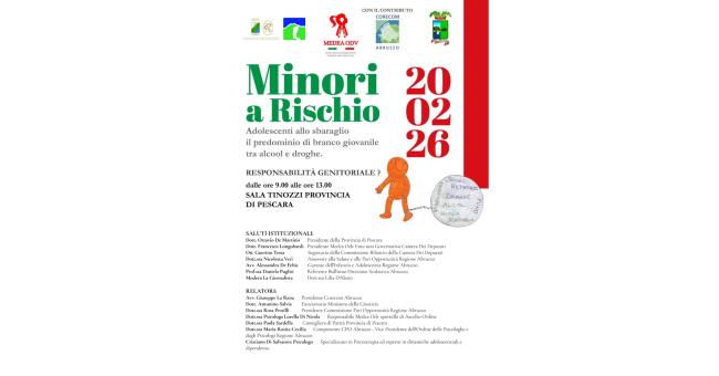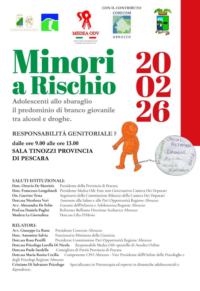 Un incontro di estrema attualità, valore collettivo e “urgenza sociale” avrà luogo nella Sala Tinozzi della Provincia venerdì 20 febbraio, dalle ore 9 alle ore 13, per approfondire il delicato tema della fragilità adolescenziale e della responsabilità genitoriale. Fortemente voluto dalla Medea Odv con il suo presidente, il dott. Francesco Longobardi, l’incontro - che si intitola “Minori a rischio. Adolescenti allo sbaraglio, il predominio di branco giovanile tra alcool e droghe. Responsabilità genitoriale?” - si avvale del patrocinio della Provincia di Pescara e della Commissione Pari Opportunità della Regione Abruzzo con forte sostegno e contributo del Corecom Abruzzo al fine di far luce sugli “adolescenti a metà, con un blackout cognitivo, con totale assenza di ispirazioni valoriali, incapaci di riconoscere la risonanza emotiva dei loro gesti, quasi sempre con povertà familiari, educative, affettive e relazionali. – spiega Longobardi - Vogliamo parlarvi della perdita della responsabilità genitoriale e del predominio di branco giovanile L’azione di gruppo potenzia quella della violenza individuale, cancella la coscienza morale di ciascuno. A nostro parere una società che giudica un minore e dopo averlo giudicato lo mette in carcere è una società malata che sta giudicando se stessa e la propria malattia”.