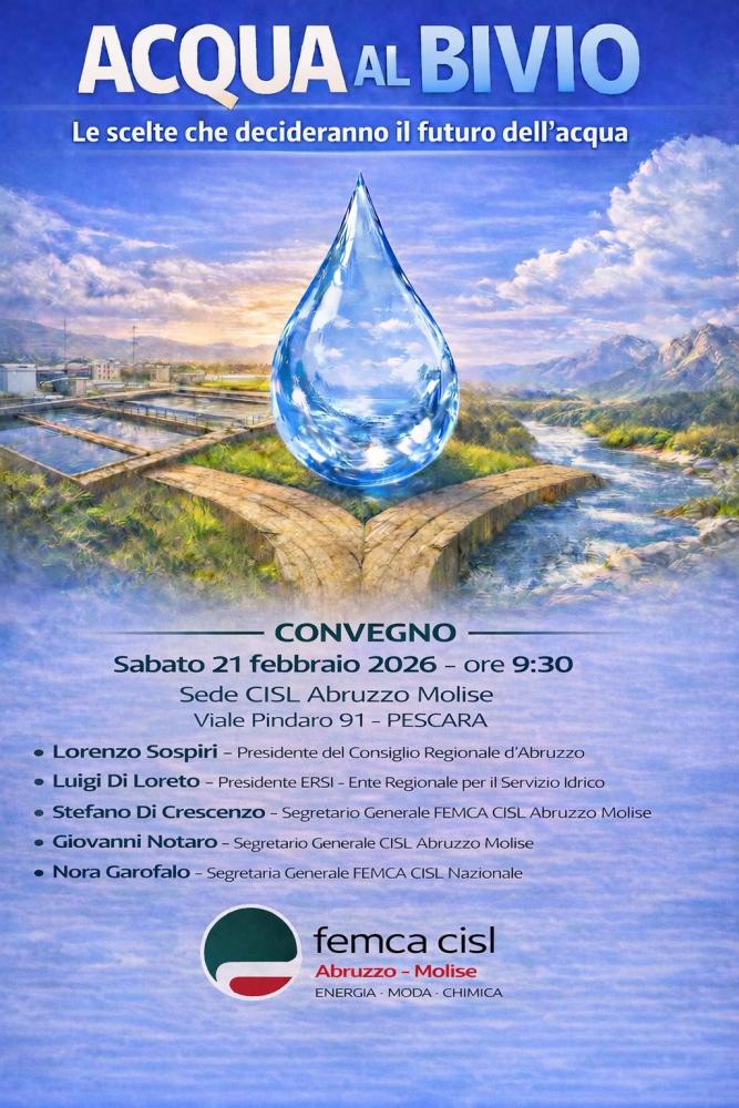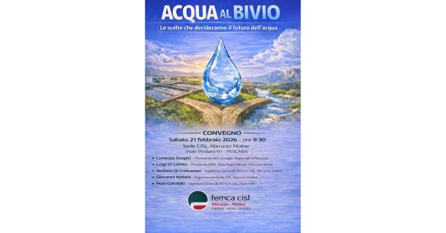 “Acqua al bivio. Le scelte che decideranno il future dell’acqua”: è questo il titolo del convegno organizzato dalla Femca Cisl AbruzzoMolise, sabato 21 febbraio dalle ore 9.30 presso la sede della Cisl in viale Pindaro 91. Dopo i saluti introdurrà i lavori il Segretario Generale della Femca CISL AbruzzoMolise Stefano Di Crescenzo.