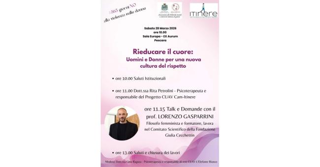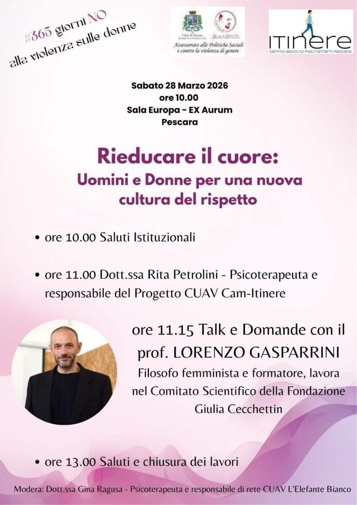 Nell’ambito del calendario “365 giorni no alla violenza sulle donne”, promosso dal Comune di Pescara, il CAM Itinere di Pescara (Centro di Ascolto Maltrattanti) ha organizzato per sabato 28 marzo, all’Aurum (ore 10, Sala Europa), un incontro pubblico sul tema “Rieducare il cuore: uomini e donne per una nuova cultura del rispetto”. L’evento, annuncia Cristina Marcone, Presidente della cooperativa sociale L’Elefante, che gestisce il CAM, vedrà la partecipazione di Lorenzo Gasparrini, filosofo femminista e formatore professionista, impegnato da anni nella formazione, sensibilizzazione e divulgazione sui temi di genere, con particolare attenzione al coinvolgimento del pubblico maschile. Fa parte del Laboratorio Tematico della Fondazione Una Nessuna Centomila ed è membro del Comitato Scientifico della Fondazione Giulia Cecchettin.