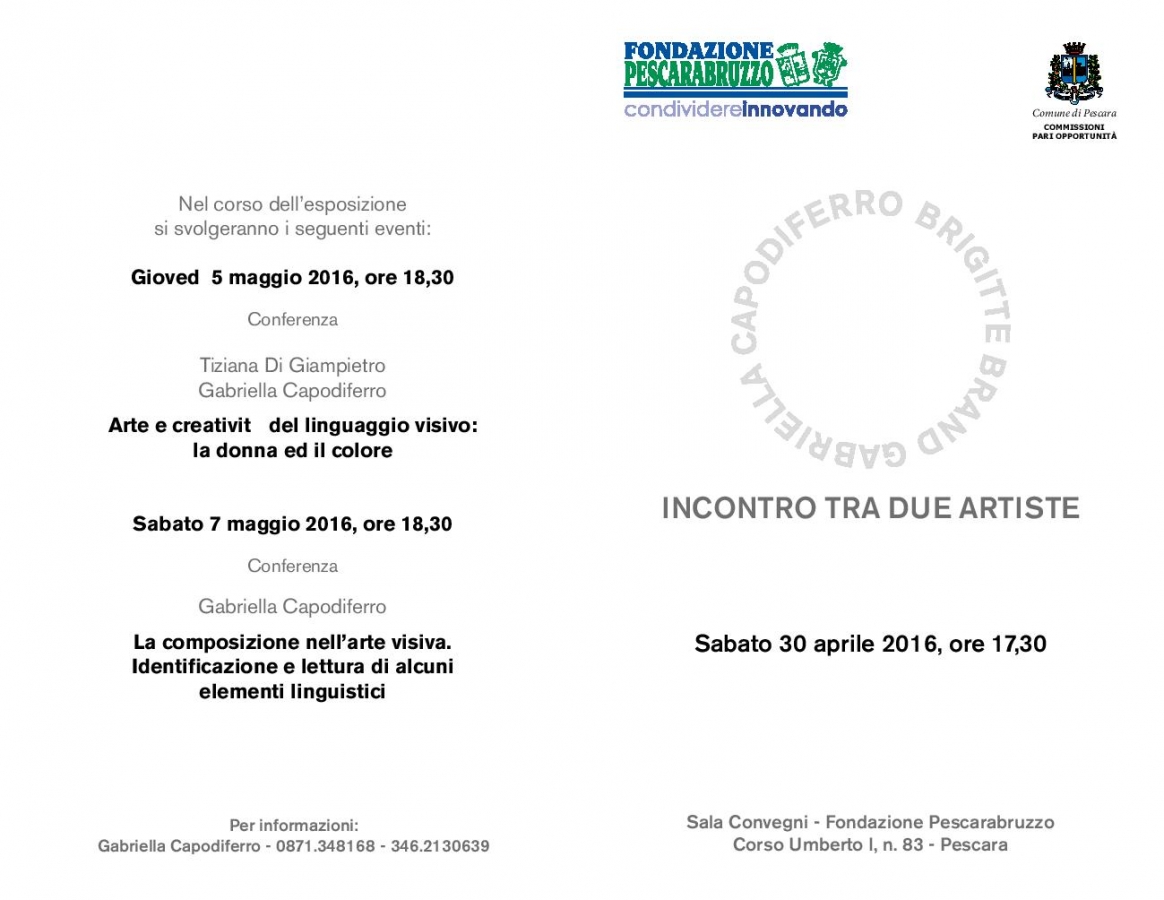 Inaugurazione: Sabato 30 Aprile 2016 ore 17,30, della mostra delle artiste Brigitte Brand e Gabriella Capodiferro, che sarà possibile visitare fino al 12 Maggio, presso la Maison des Arts, Fondazione Pescarabruzzo, Corso Umberto I, n. 83 – Pescara.