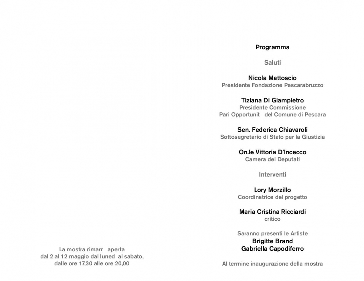 Durante i dieci giorni di esposizione dei quadri delle due artiste, Brigitte Brand e Gabriella Capodiferro, si terrà l’inaugurazione, in cui saranno presenti l’Onorevole Federica Chiavaroli, e l’Onorevole Vittoria D’incecco, il Presidente della Fondazione prof. Nicola Mattoscio , la Presidente della CPO, dott.ssa Tiziana Di Giampietro e la Commissione Pari Opportunita’ del Comune di Pescara. Della mostra verrà pubblicato un volume che farà parte della collana “Arte e cultura” della Fondazione Pescara Abruzzo