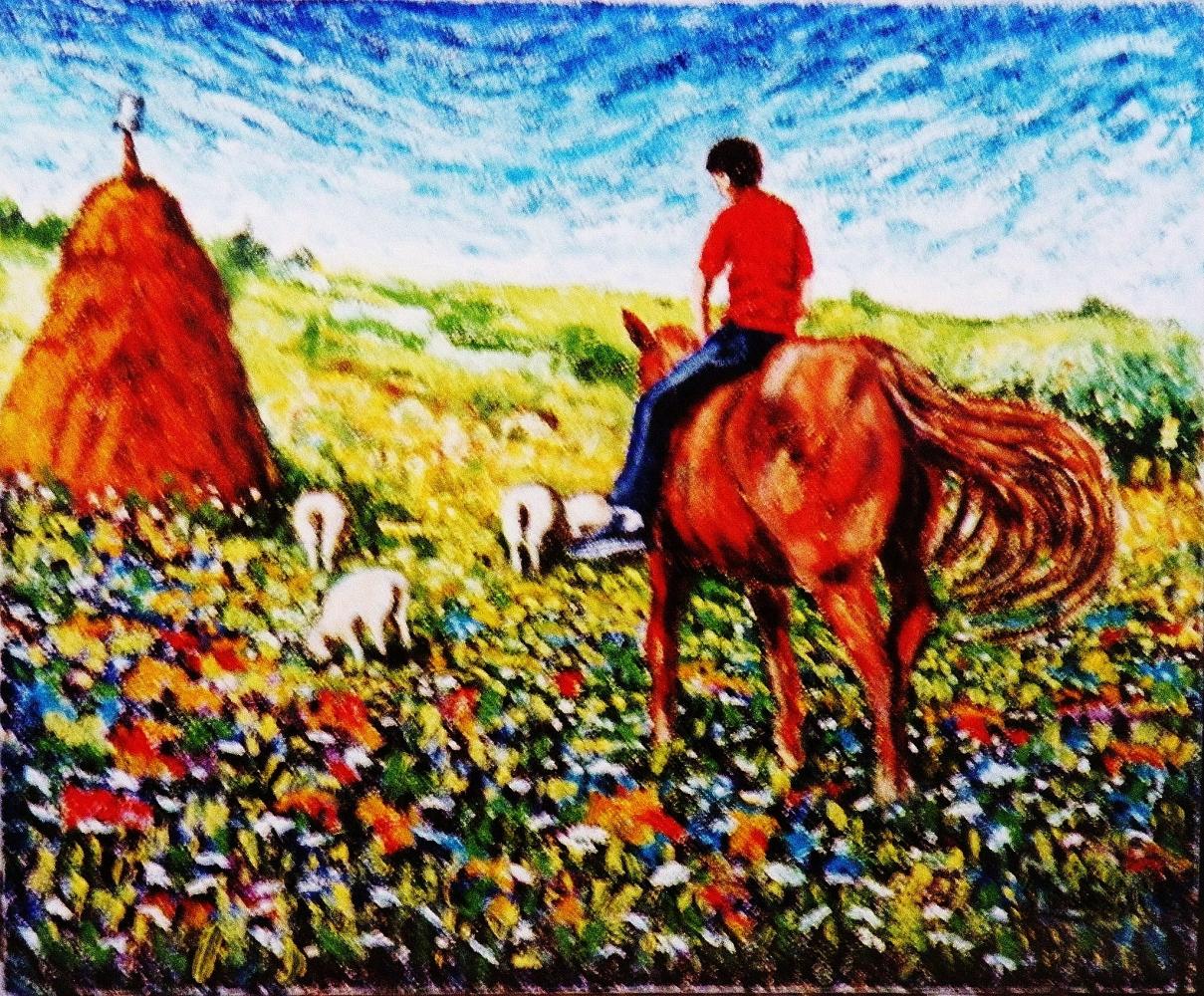 Le rustiche masserie, gli ulivi verdeggianti, i solitari pagliai prendono una mirabile vita dalla tavolozza di Gaetano Minale, dove il giallo, il bleu d’ olttremare, la seppia naturale e gli altri colori si compongono in una miriade di infinite variazioni per evocare un mondo georgico, dove l’ esistenza è data da un’ alta poesia , da un costante invito alla pace alla fratellanza e soprattutto da un onnipossente desiderio di sopravvivenza .