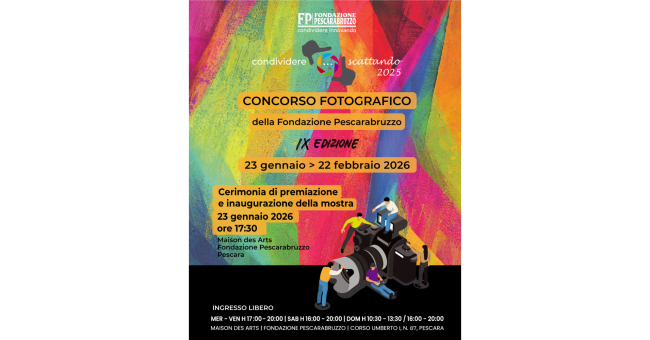 La Fondazione Pescarabruzzo è lieta di annunciare l’inaugurazione della mostra fotografica “Condividere… Scattando 2025”, che si terrà venerdì 23 gennaio alle ore 17:30 presso la Maison des Arts della Fondazione, a Pescara.