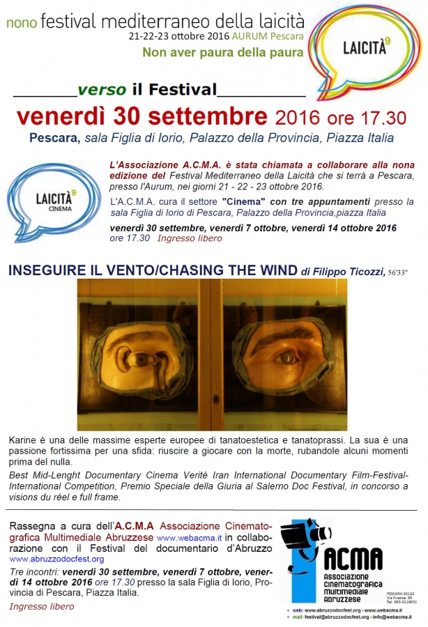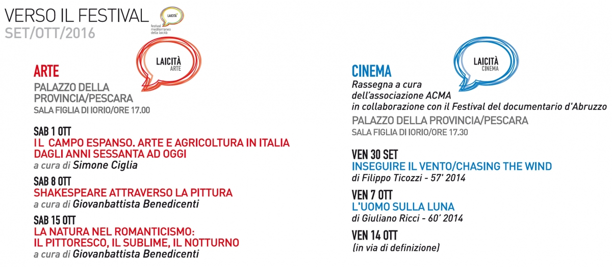 Ad anticipare l'edizione 2016 sarà "Verso il Festival" che propone una serie di eventi tematici: Laicità Cinema, Laicità Arte e Laicità Musica con incontri nella sala Figlia di Iorio della Provincia di Pescara in Piazza Italia.