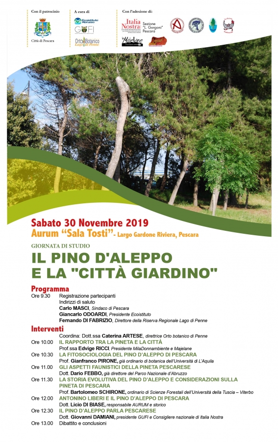 Sabato 30 novembre, presso la Sala Tosti dell’Aurum di Pescara, avrà luogo un convegno sul “Pino d’Aleppo e la città giardino”. Dalle ore 10 alle 13, dopo i saluti del Sindaco di Pescara, del Direttore della Riserva Naturale Lago di Penne e del Presidente dell’Associazione Ecoistituto Abruzzo, promotori dell’iniziativa, si succederanno esperti che relazioneranno:
