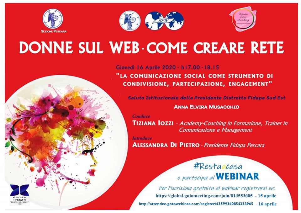La FIDAPA sezione di Pescara, alla luce dell’attuale situazione e delle linee guida dettata dalla Fidapa Nazionale sul tema della comunicazione e la relazione con i Media, ha voluto rivolgere a questa azione una particolare attenzione alla comunicazione digitale ed ha organizzato un meeting on line dal titolo “Donne sul Web- come creare rete”.