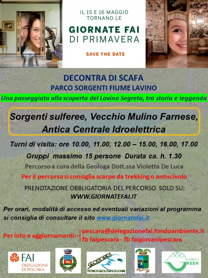 La Delegazione di Pescara, proporrà ai visitatori delle Giornate FAI di Primavera un itinerario naturalistico che permetterà di scoprire le bellezze di quest’area: le polle sorgive e piccoli laghetti che assumono un colore turchese, verranno illustrati i caratteri geologici, si procederà verso il Mulino costeggiando antiche opere di canalizzazione e durante il tragitto verranno raccontate le caratteristiche della flora e della fauna del parco. Si arriverà quindi all’ex Mulino Farnese, un mulino ad acqua impiantato alla fine del 1600 dove saranno illustrate le caratteristiche architettoniche e storico-culturali e mostrato l’interno dove verrà letto un brano sulle tradizioni legate al luogo. Si ripartirà verso la vecchia centrale idroelettrica, al cui interno si potrà accedere e la cui visita sarà occasione per narrare la storia dello sviluppo industriale dell’area.