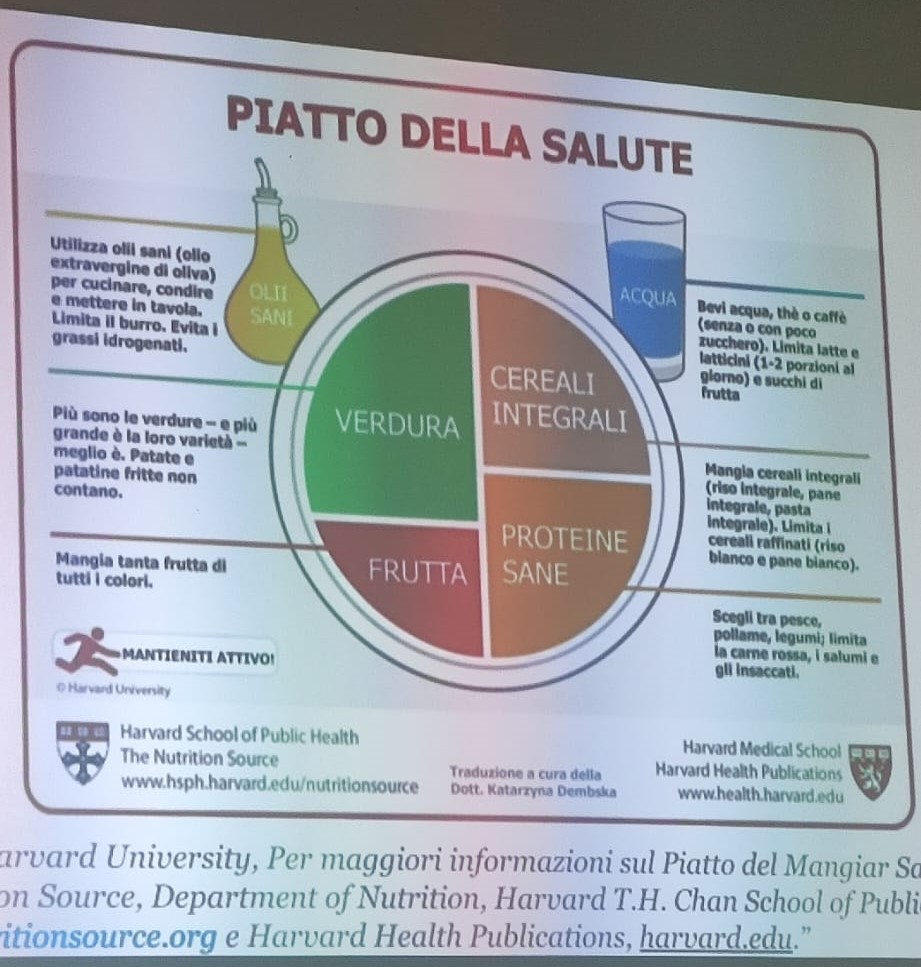 Una delle slide presentate dal dott. Conti conteneva l’immagine del piatto della salute, elaborato dalla Harvard University, dove erano indicate le quantità di alimenti necessari per una buona vita.