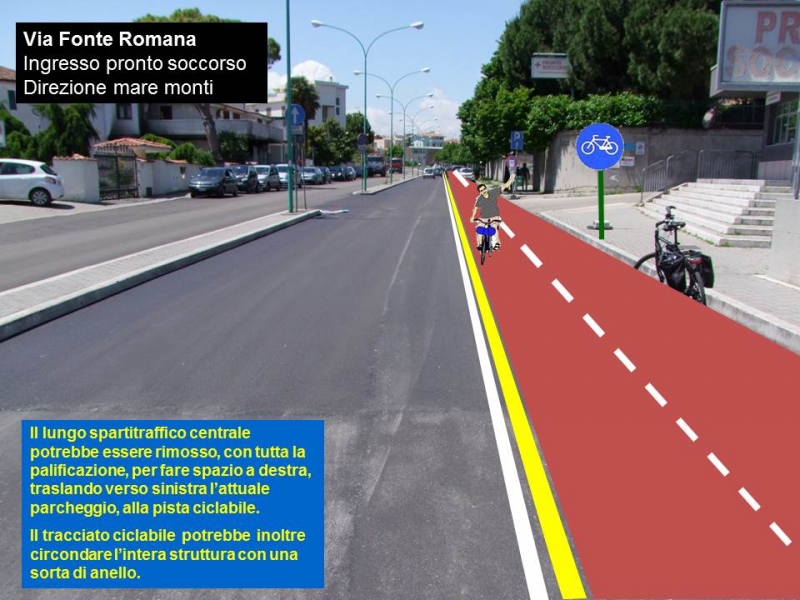 Tempo fa immaginammo, disegnando "le tentazioni di Pescarabici", alcuni scenari di un possibile utilizzo ciclistico di diverse vie cittadine, che tutt'intorno all'area dell'ospedale ci fosse un viale circolare di protezione, un cuscinetto stradale, una sorta di membrana viaria ciclabile a costituire una gradazione di accesso alla struttura sanitaria. Pensiamoci un attimo: eliminiamo tutte le auto parcheggiate che circondano la vie dell'ospedale e sostituiamole con un viale solo ciclabile, una sorta di circumospedaliera che separa la zona pedonale interna all'ospedale da quella esterna ad uso automobilistico. I parcheggi sono già in parte garantiti da due strutture dedicate esistenti, ma può darsi anche che non ne servano così tanti. Infatti va considerato che se si aumenta lo spazio dedicato a chi si sposta in bicicletta, per questi il parcheggio non serve più, anzi servono stalli presidiati per bici. Poi forse nascerà l'esigenza di collegare questo anello ciclabile ad altri anelli realizzati con lo stesso spirito in altre parti della città , come intorno alla stazione ferroviaria, ad esempio. Di una possibile soluzione di questo tipo abbiamo già parlando in una precedente riflessione sull'uso integrato di via Aremogna con un tracciato ciclabile che passando per le sedi della Provincia e della Regione di Via Passolanciano raggiunga poi l'ospedale. Da lì poi possono nascere altre storie.