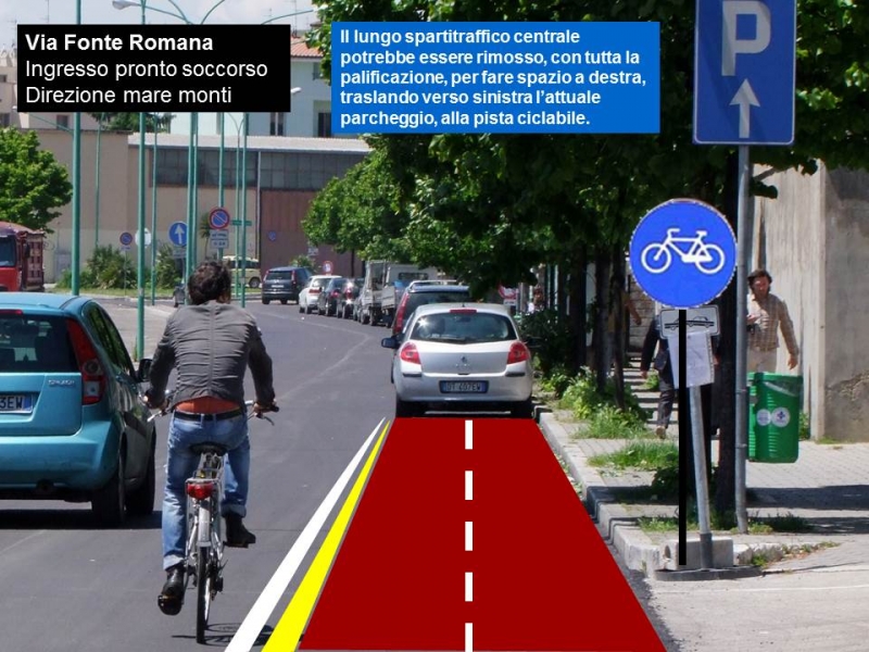 Vedono che questo spazio di asfalto nero, per adesso senza segnaletica orizzontale, è colma di automobili, che occupano per consuetudine lo spazio a destra per fermarsi e quello a sinistra per transitare, senza però che quelle destinazioni siano stato ancora assegnate dalle linee di mezzeria e di delimitazione dei parcheggi. Ma se non fosse così? Se quell'indefinito tracciato fosse destinato ad altri usi, magari diversificati?