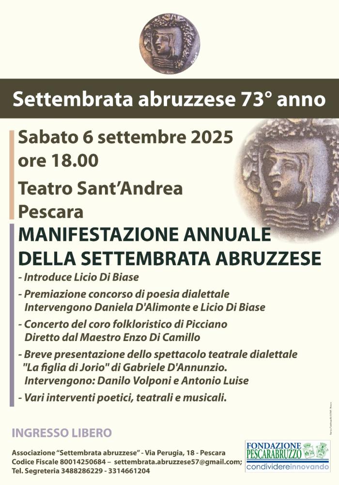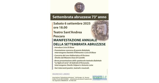 Sabato 6 settembre, con inizio alle ore 18 nel teatro Sant'Andrea, si terrà la consueta manifestazione della Settembrata Abruzzese. Nata nel 1952, questa associazione, è stata la casa del dialetto abruzzese nelle varie articolazioni: poesia, teatro, musica popolare. La Settembrata nacque in una fase particolare della vita del Paese, si usciva dalla guerra e si era in piena fase di ricostruzione, c'era la Speranza in un futuro migliore, di Pace e di Serenità .