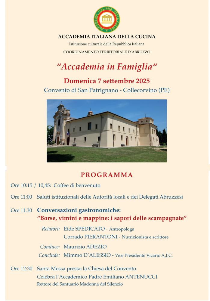 Ieri al Convento di San Patrignano un incontro Accademia in famiglia per le delegazioni abruzzesi dell’Accademia Italiana della Cucina. Appuntamento che, per il quarto anno, vede riunirsi le Delegazioni Abruzzesi per trascorrere ore insieme, tra i soci, per conoscersi e condividere esperienze culturali. Per questo quarto anno l’incontro è stato nel territorio Vestino dell’entroterra pescarese tra i borghi di Collecorvino e Picciano.