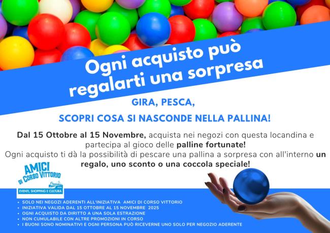 La prima iniziativa è un gioco a sorpresa. Ogni cliente, dopo aver effettuato un acquisto, in uno dei negozi associati, può prendere una pallina colorata posta in un contenitore sul banco del negozio. La sorpresa è immediata, all’interno della pallina ci sarà un foglietto con il nome di un negozio associato. Il cliente potrà andare nel negozio indicato e lì l’esercente svelerà il premio nascosto.