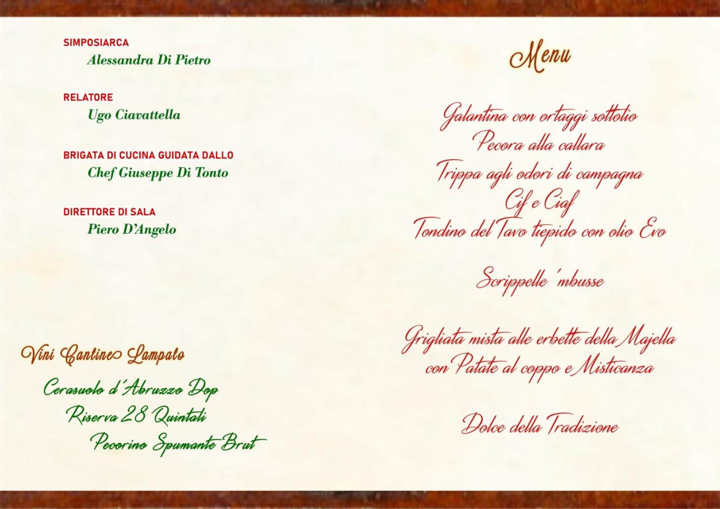 Dopo la dettagliata elencazione delle pietanze del menu proposto, il dott. Ciavattella, medico veterinario, esperto e cultore dell’argomento, ha parlato dell’uso tradizionale del consumo e della cottura delle carni di animali da reddito: pollame, maiali, ovini e bovini e ha plaudito l’iniziativa dell’Accademia per la promozione della conoscenza della cultura tradizionale abruzzese.
