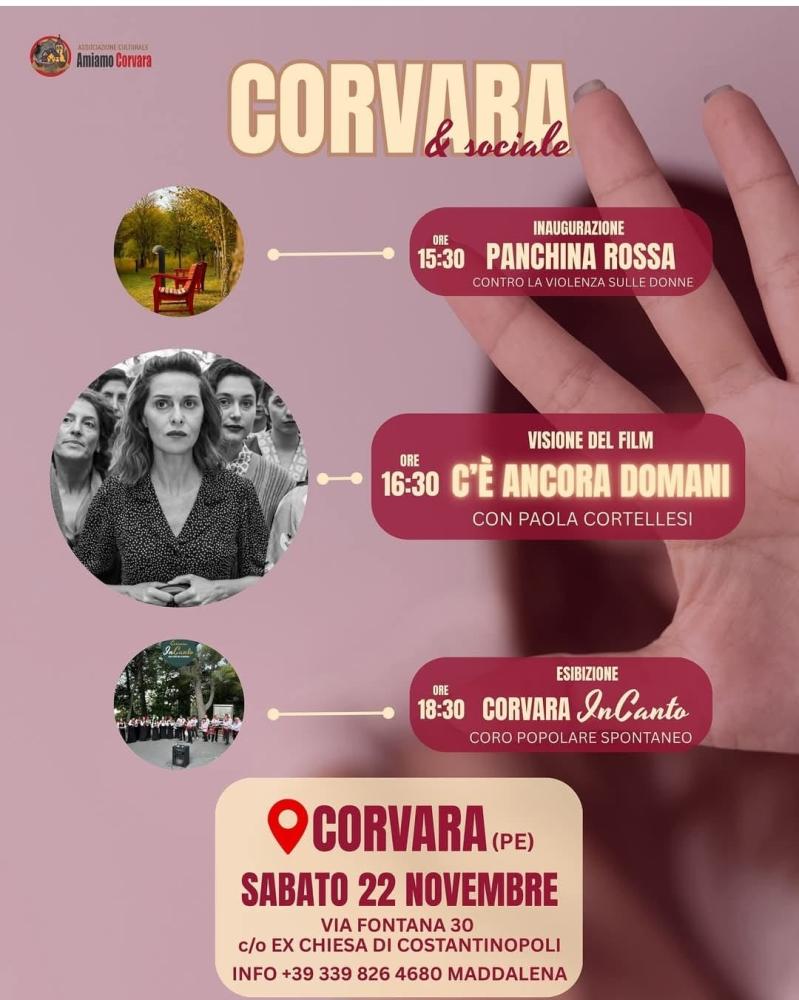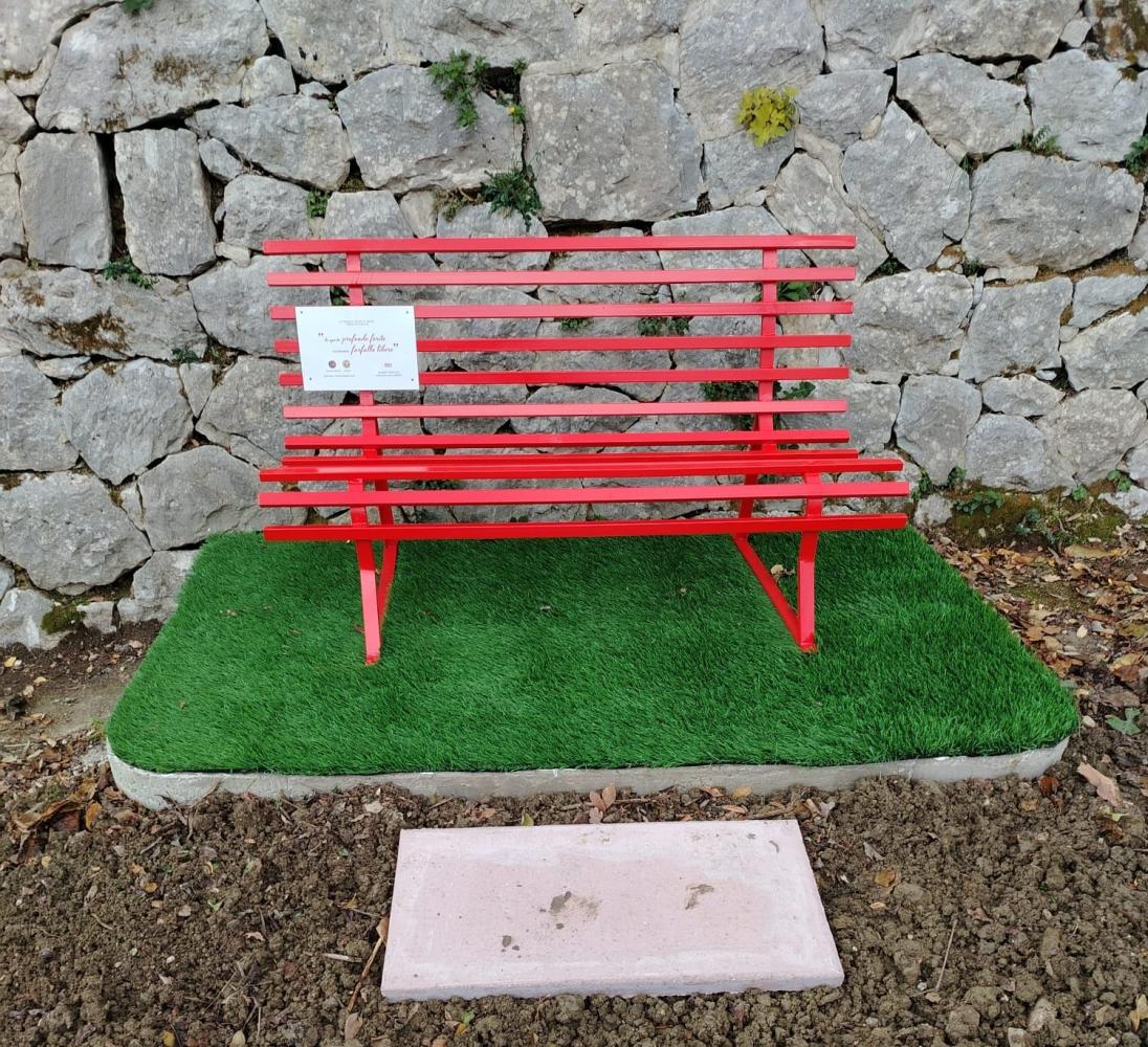 Nel giardino vicino la Chiesa, nel Comune di Corvara, piccolo paese montano dell'entroterra pescarese, posizionato ai piedi del monte La Queglia, il 22 novembre, la neo Associazione Amiamo Corvara ha fatto installare la panchina rossa, quale simbolo contro la violenza sulle donne e contro il dilagare del femminicidio.