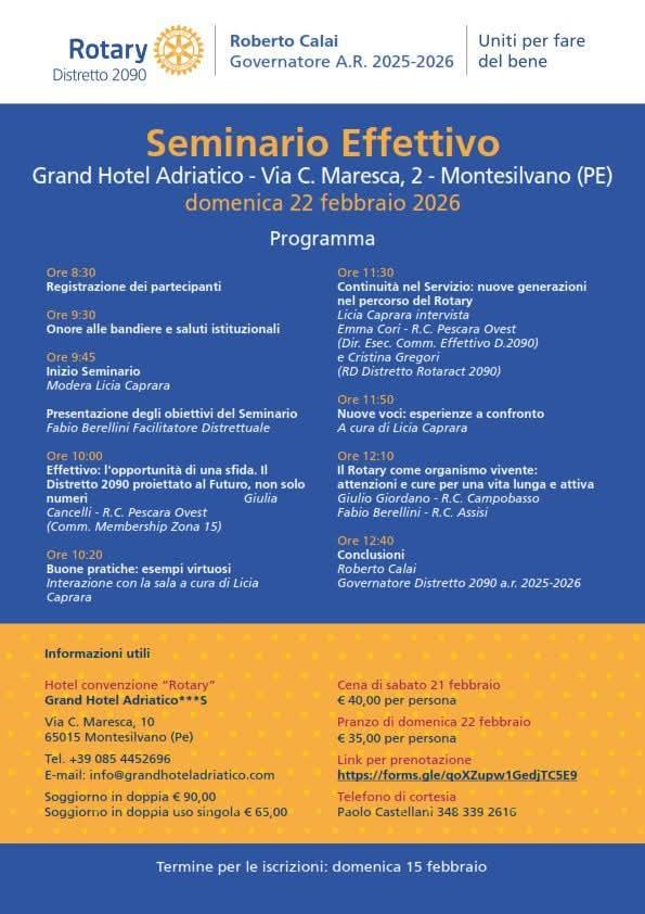 A condurre e moderare il seminario la giornalista socia rotariana Licia Caprara che ha intervistato Emma Cori Club Pescara Ovest, Cristina Gergori Distretto Rotaract 2090, ascoltato le esperienze a confronto che vari soci hanno portato con il loro intervento. Importante anche l’intervento che ha avuto come titolo il Rotary come organismo vivente: attenzioni e cure per una vita lunga e attiva, con i soci Giulio Giordano Club di Campobasso e Fabio Berellini del club di Assisi.