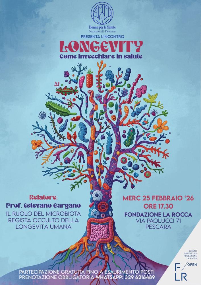 25 febbraio, presso i locali della Fondazione La Rocca di Pescara, si è tenuto un interessante incontro organizzato dall’associazione AMMI Donne per la Salute di Pescara dal titolo: Longevity, come invecchiare in salute. Ospite e relatore i prof Estevano Gargano che ha parlato di: Il ruolo del Microbiota regista occulto della longevità umana.