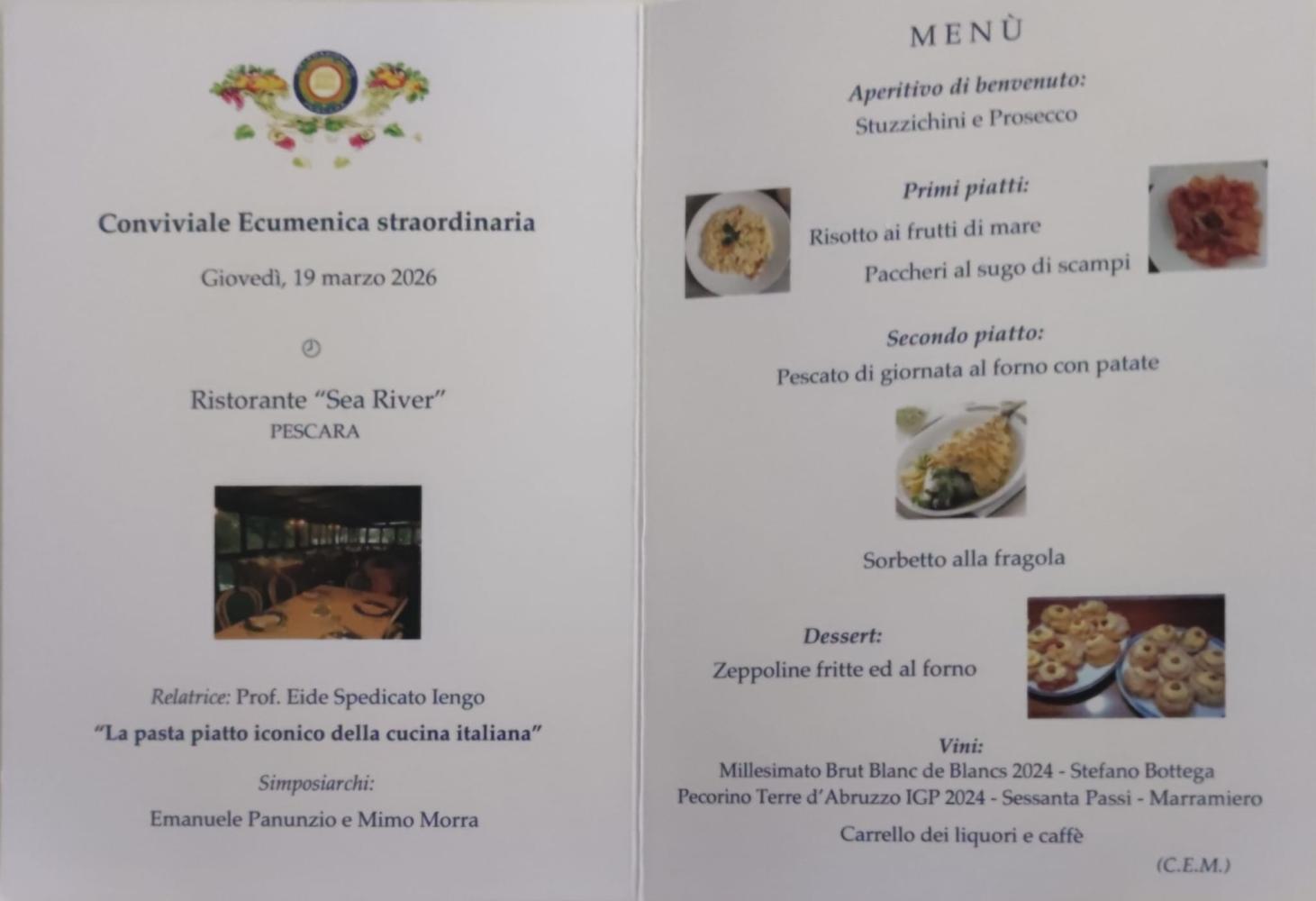Pescara, presso il ristorante Sea River di Pescara, il 19 marzo 2026, le Delegazioni Pescara, con il Delegato Giuseppe Fioritoni, e Pescara Aternum, con il Delegato Giuseppe Di Giovacchino, dell’Accademia Italiana della Cucina, hanno voluto celebrare insieme una Conviviale Ecumenica Straordinaria. Questa conviviale è stata organizzata per celebrare ed evidenziare le tradizioni locali al fine di confermare la forza della cucina italiana che è proprio nella straordinaria biodiversità culturale.
