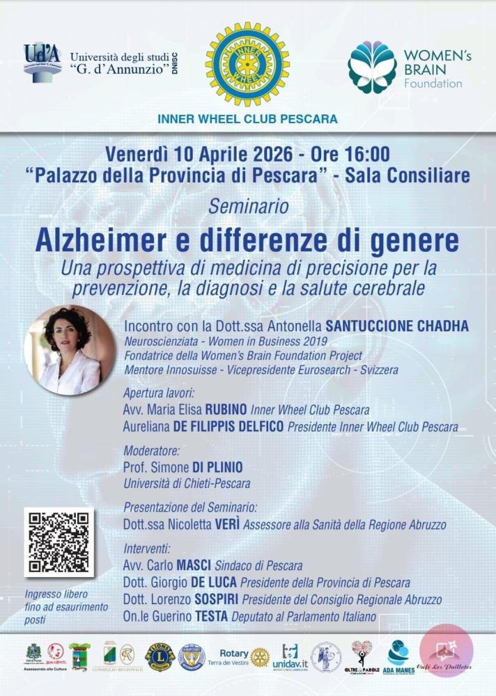 L’evento Alzheimer e differenze di genere" -Una prospettiva di medicina di precisione per la prevenzione, la diagnosi e la salute cerebrale, è stato organizzato dal club Inner Weel Pescara con la sua Presidente Aureliana De Filippis Delfico e la presentazione e apertura dei lavori dell’avv. Maria Elisa Rubino socia del club.