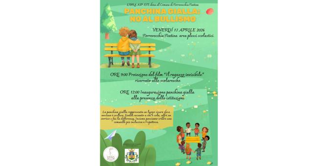 Venerdì 17 aprile dalle ore 9:00 Torrevecchia Teatina insieme alle scuole della cittadina teatina vivrà un momento di grande impatto sociale insieme all’APS-ETS LIBRA: la consegna all’amministrazione comunale della panchina gialla contro il bullismo e il cyberbullismo.