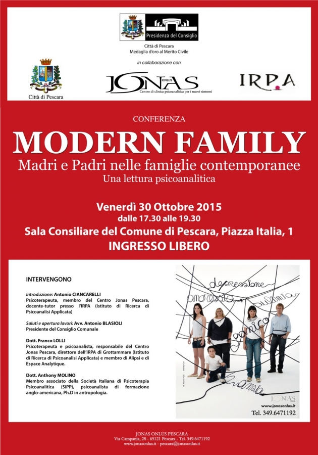Presentata stamane l'evento "Modern Family, Madri e Padri nelle famiglie contemporanee", che si svolgerà venerdì alle 17,30 presso la Sala Consiliare, organizzato dalla Presidenza del Consiglio Comunale di Pescara in collaborazione con Jonas Pescara (Centro di Clinica Psicoanalitica) e l'IRPA (Istituto di Ricerca di Psicoanalisi Applicata). Alla conferenza hanno preso parte il presidente del Consiglio Comunale Antonio Blasioli e Antonio Ciancarelli, motore dell'iniziativa per le associazioni organizzatrici.