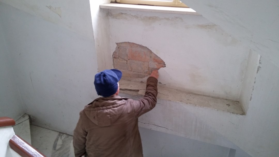 La tinteggiatura esterna della palazzina cade ormai a pezzi insieme a parti di muro, soprattutto nelle vicinanze delle finestre, l'atrio interno e le scalinate in più punti presentano spaccature nei muri e una enorme infiltrazione d'acqua sotto al tetto.