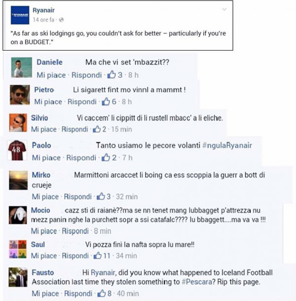 Gli abruzzesi, dopo la notizia dell'abbandono dell'Areoporto d'Abruzzo da parte di Ryanair (leggi), hanno "attaccato" a suon di frasi in dialetto la pagina facebook della compagnia aerea irlandese.