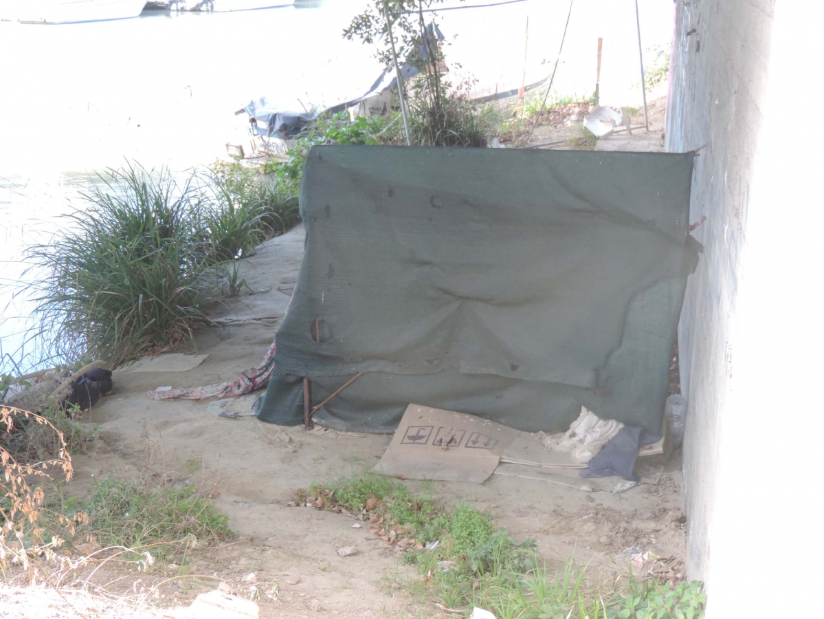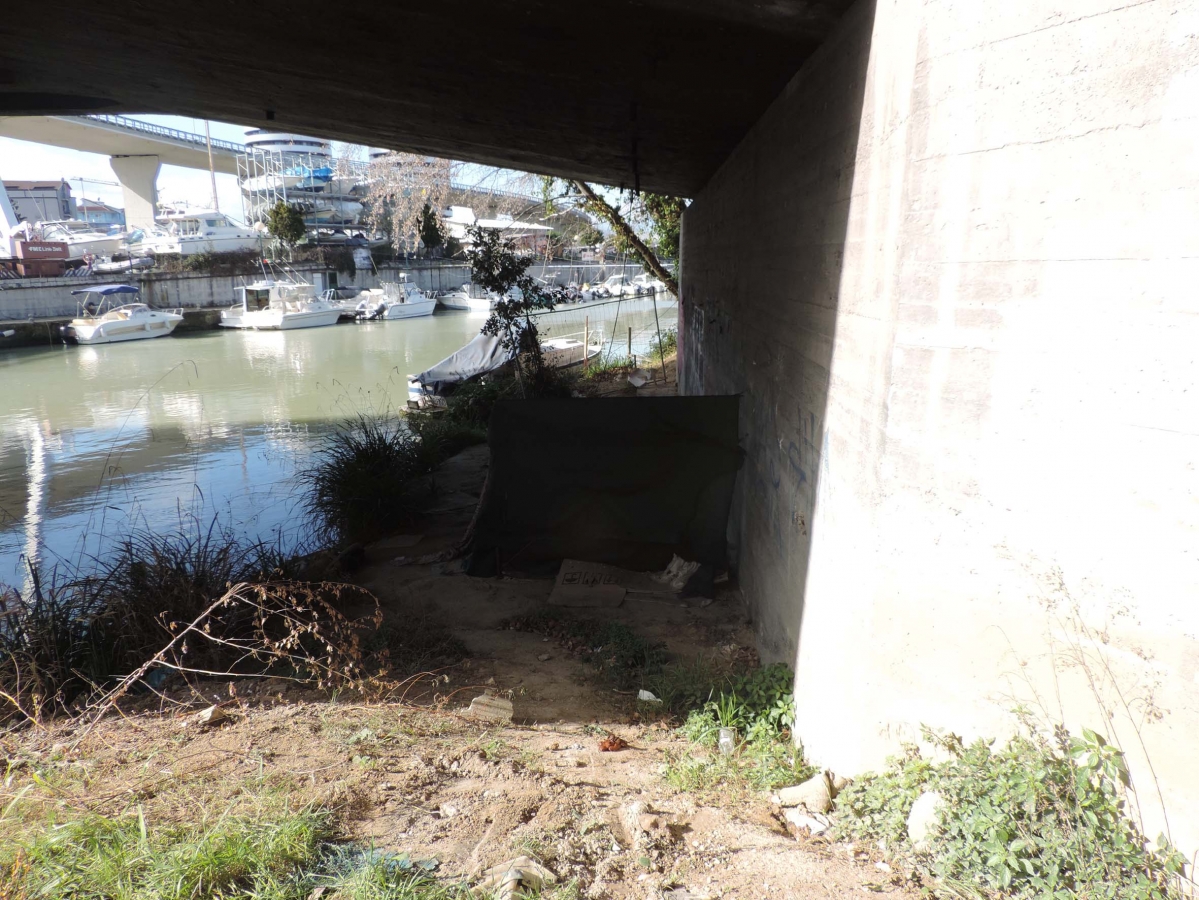 “Una vecchia tenda da campeggio montata sotto il ponte, sulla sponda del fiume lato nord, e, accanto, cartoni vecchi con cui proteggersi dal freddo della notte e qualche straccio gettato a terra.