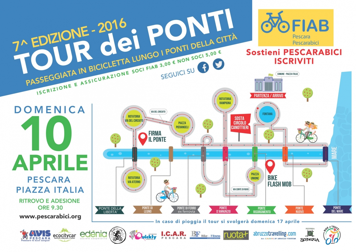 Anche quest'anno, per la settima volta consecutiva, si svolge il Tour dei Ponti, passeggiata in bicicletta che FIAB Pescarabici organizza per promuovere la mobilità ciclistica urbana attraversando i ponti della città , che siano ciclabili o meno. Il tour di svolgerà domenica 10 aprile, con ritrovo alle 9,30 e partenza alle ore 10,30 con partenza e arrivo a Piazza Italia.
