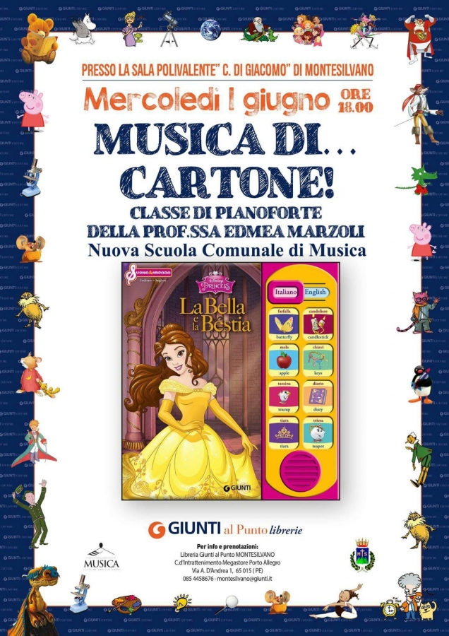 Musica e lettura per i bambini. Questi i principali ingredienti del nuovo appuntamento organizzato dalla Nuova Scuola Comunale di Musica di Montesilvano, per domani, mercoledì 1 giugno alle ore 18. La Sala C. D Giacomo ospiterà un pomeriggio dedicato al cinema di animazione e alle sue bellissime ed inconfondibili colonne sonore, organizzato in collaborazione con la libreria Giunti del centro di intrattenimento Porto Allegro.