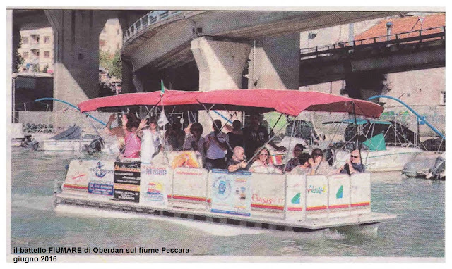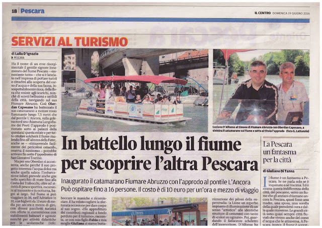 Sabato 25 giugno è stato inaugurato il servizio di trasporto turistico (per ora) sul fiume Pescara dal battello “FIUMARE” di Oberdan Caposano, proprietario del circolo nautico “L’ancora”, sulla sponda nord del fiume vicino all’antico Circolo Canottieri, dove il battello-catamarano attracca.